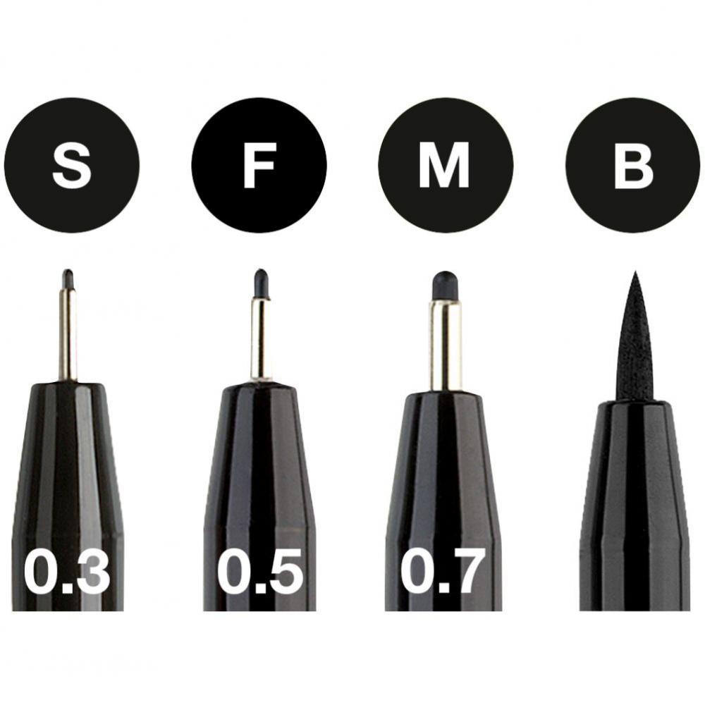 4 umelecké fixky v čiernej farbe s rôznymi hrúbkami hrotov (S, F, M, B), určené na kresbu, skicovanie a detailnú prácu.