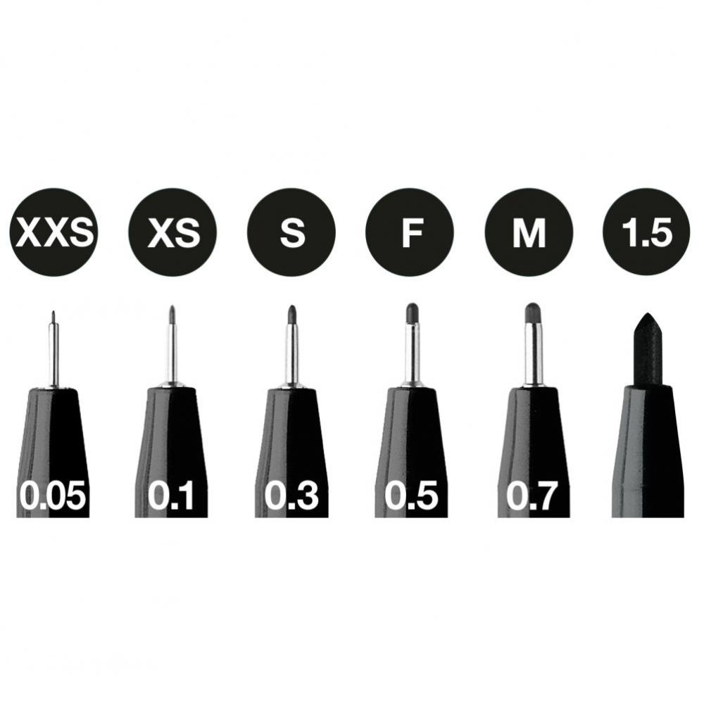 6 umeleckých fixiek v čiernej farbe s rôznymi hrúbkami hrotov (XXS, XS, S, F, M, 1.5), určené na kresbu, skicovanie a detailnú prácu.