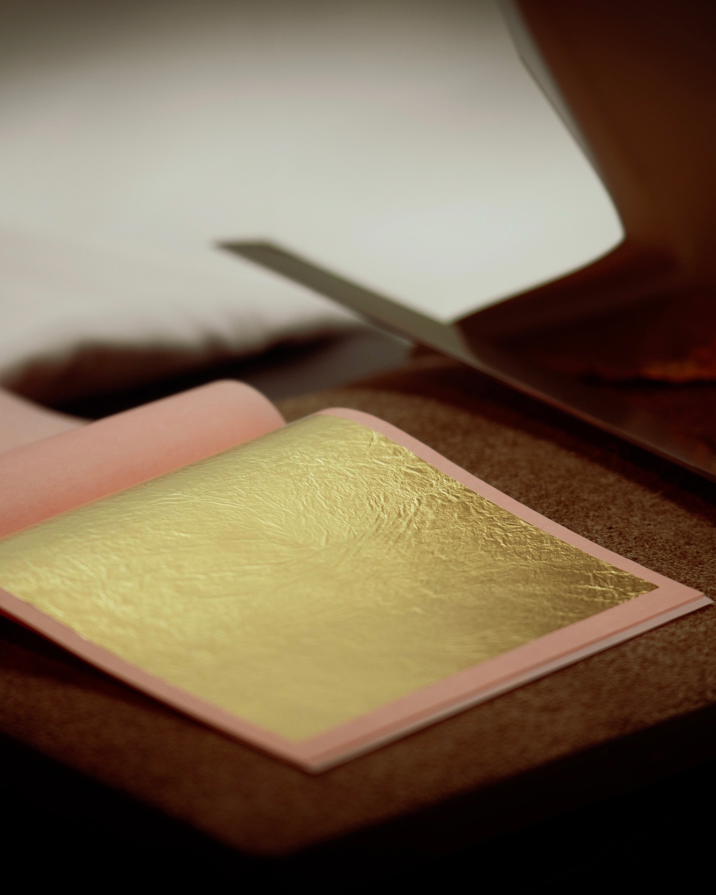 23-karátové zlato v podobe tenkých plátkov voľne uložených na hodvábnom papieri. Vhodné na profesionálne zlatenie interiérových povrchov.