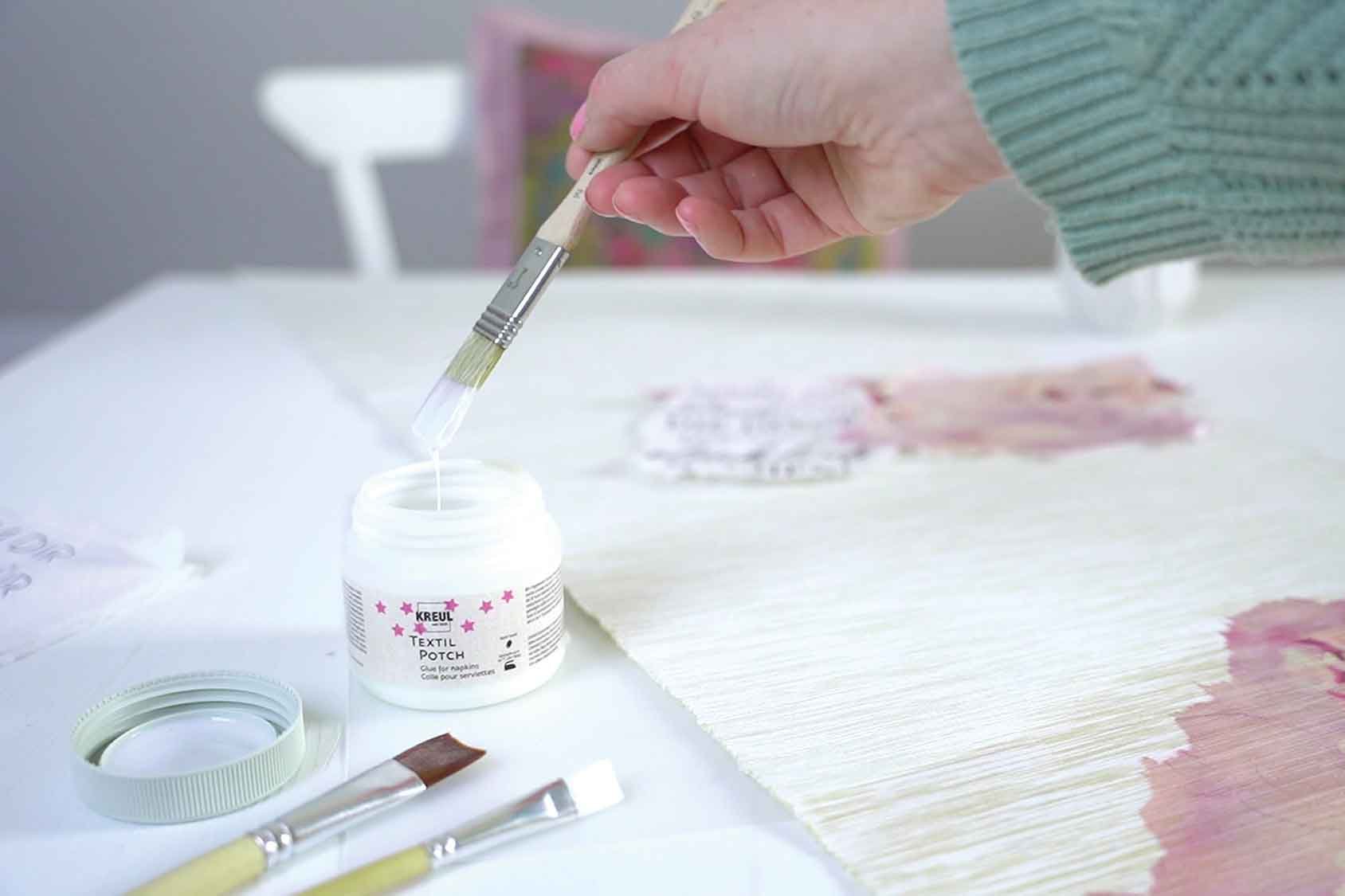 Po zaschnutí zostáva priehľadné so saténovým leskom, čo umožňuje preniesť dekoratívne motívy z papierových servítok priamo na látku.